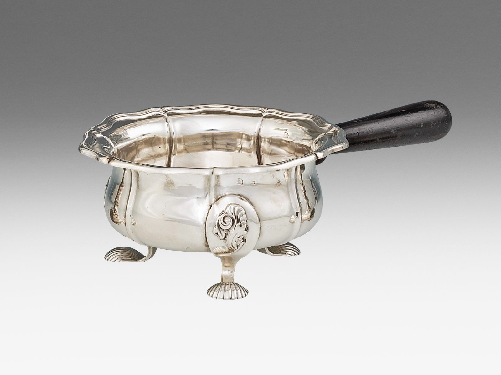 Ezüst, 776 g. Szögletes forma, karéjos peremmel, ívelt fogóval.