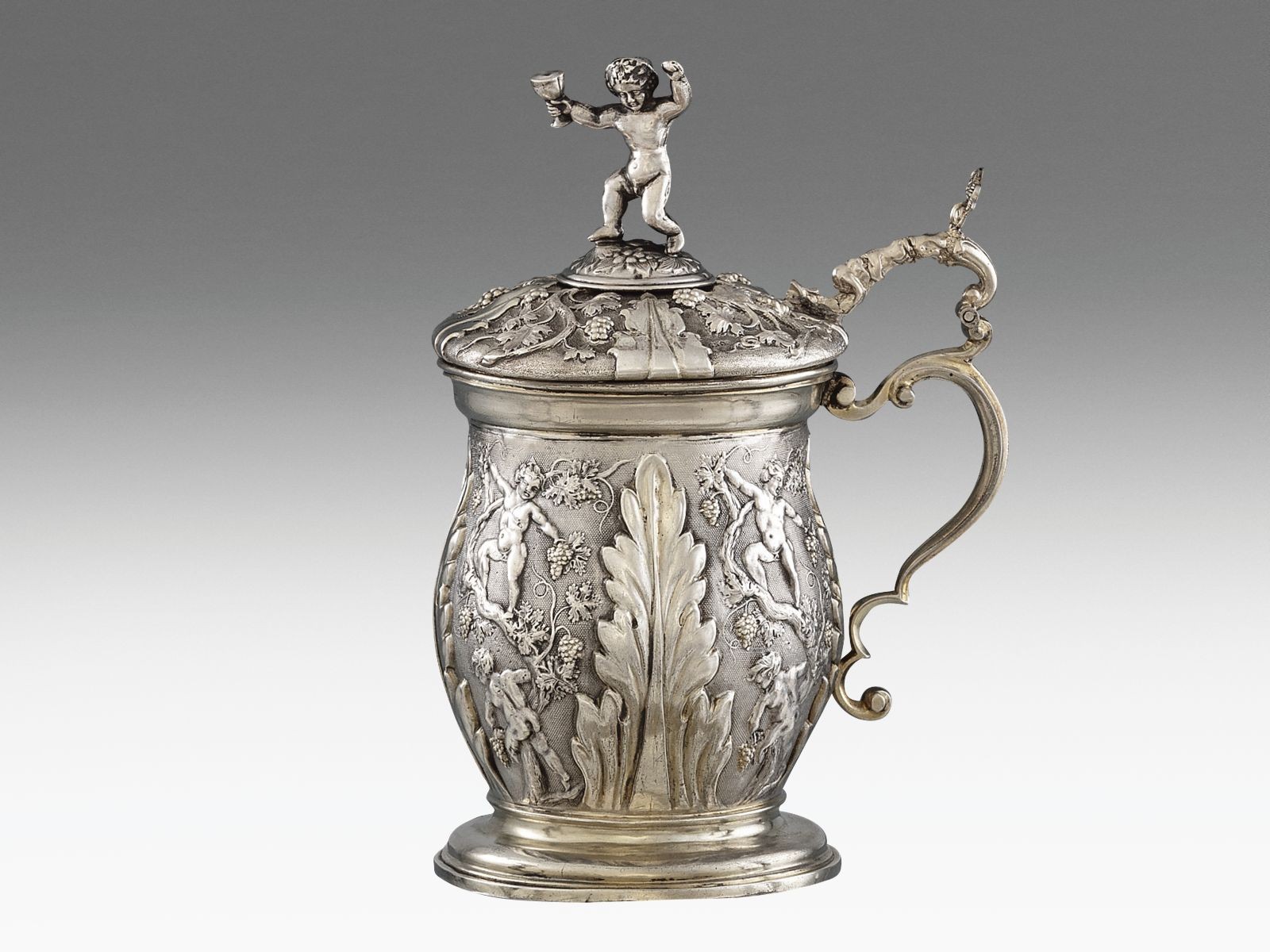 Részben aranyozott ezüst, 505 g. Kerek talpon hengeres edénytest, felületén több helyen visszatérő díszítőelemek, akantuszlevelek_x000D_ között domborított, poncolt és vésett szőlőfürtös-indás szüreti jelenet. Zsanéros billenőfedelén öntött és cizellált,