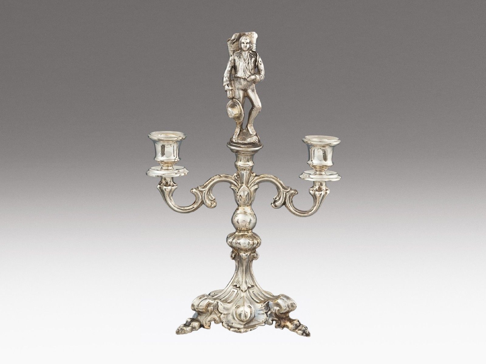 Ezüst, 271 g. Stilizált lábakon álló akantuszleveles talpon golyó alakú szár, indásan hajló, kétkaros gyertyatartóval. Középen figurális gyufatartó: puttonyos férfialak, kezében kalappal. Restaurált.