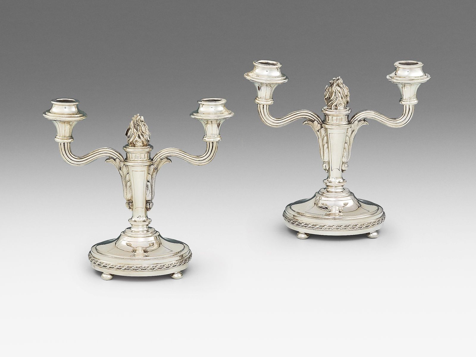 Ezüst, 405 g. Négy golyó lábon álló szögletes talapzat, rajta áttört, levéldíszes palacktartók között stilizált empire motívumokkal