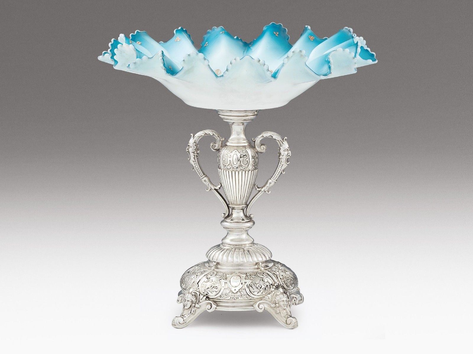 Ezüst, 259 g. Négy legyezőkagylós-női fejekkel díszített lábon kerek talp, rajta vázaidomú szár kétoldalt maszakónés fülekkel, eredeti leszorítógombbal. Felületén domborított, poncolt és vésett historizáló díszítmények. Fúvott