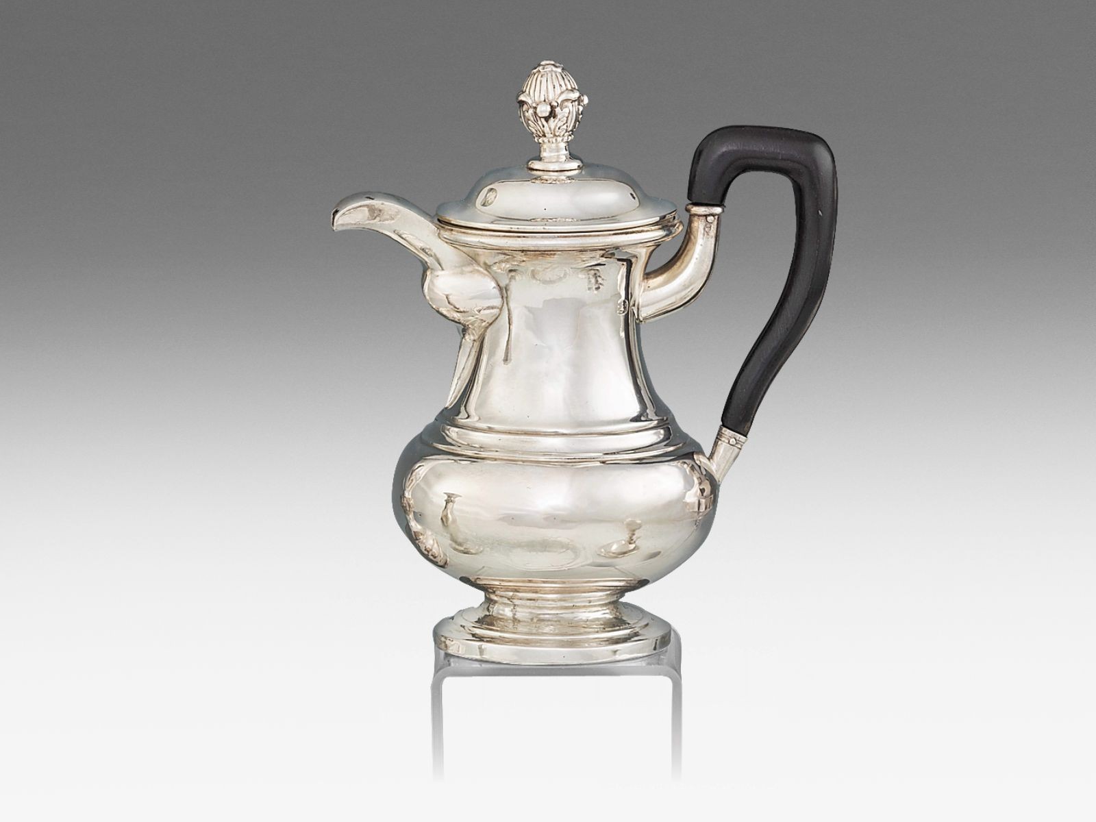 Kikiáltási ár: 20 000 FtEzüst, 87 g. Kerek talpon körte formájú edény, ívelt füllel. Zsanéros fedelén lakatpánt és pénzbedobó nyílás. Oldalán poncolt és vésett, stilizált akantuszlevelek. Fülén jelzett: feltehetően Pozsony-Vártelek, 1840 körül. M.: 9,5 cm