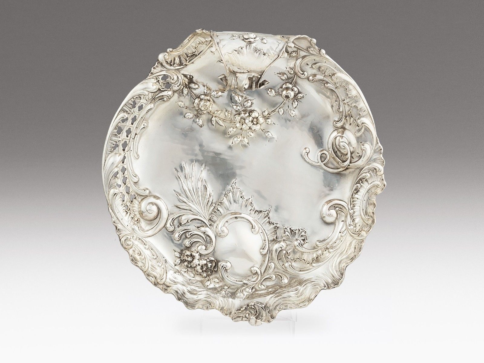 Ezüst, 770 g. Pogácsa lábakon álló, kerek forma, egyik oldalán visszahajló fogóval. Áttört peremén domborított, poncolt és vésett rokokó díszítmények. Öblében virágfüzér, valamint virágcsokorral és rokályokkal keretezett medali