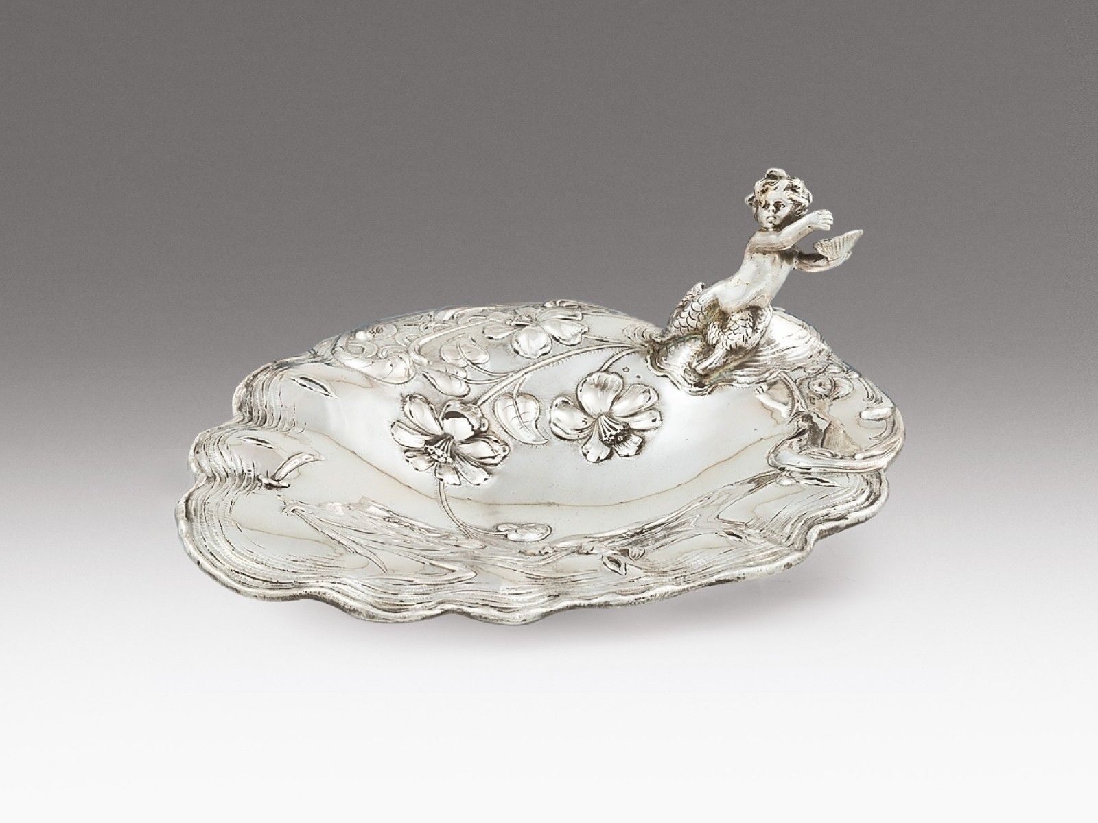 Ezüst, 714 g. Stilizált lábakon álló ovális tál, peremén öntött és cizellált, kezében kagylót tartó sellőgyermek. Tál felületén domborított, poncolt és vésett indák, ill. leveles-virágdíszek.