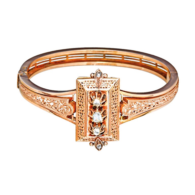 Pest, 1867-1936 közötti fémjel, 14 k arany, Hivataljellel, mesterjegy elkopva, merev, üreges pánt, áttört díszítésű vállakkal, közepén karmos foglalatban, 3 db nagyobb félhollandi rózsa csiszolású, gyémánt és 2 db apró gyémánt ékítéssel, nyelves záródássa