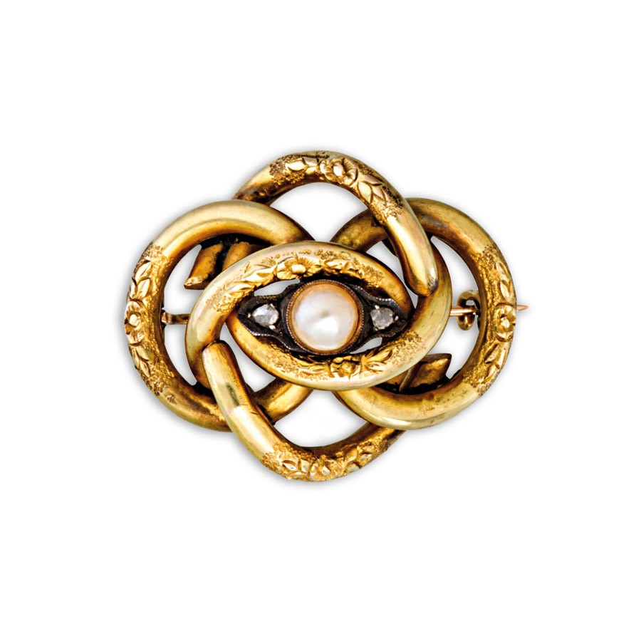 Budapest, 1937-1966 közötti fémjel, 14 k arany hurkolt, vésett fazon, Laendler Sámuel mesterjegy, ezüst középrészben 1 db mabé gyöngy, 2 db apró gyémánttal, cinnel forrasztva, kis sérüléssel, 10, 3 g, h: 3, 9 cm