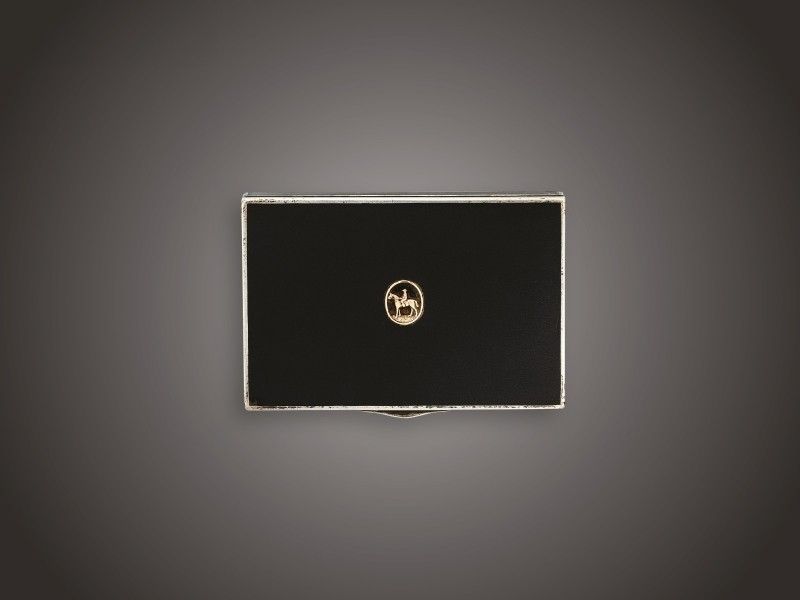 Ezüst, 160 g., belül aranyozva. Téglatestforma, felületén fekete zománc díszítéssel. Zsanéros fedelén arany applikáció: medalionban