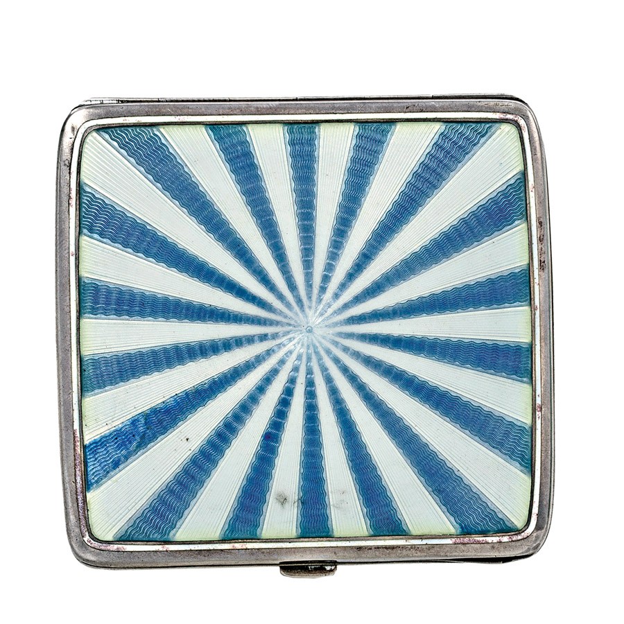 Bécs, 1902-1922 közötti behozatali jellel, 900 ezrelékes, belül aranyozott ezüst, fedlapján kék-fehér sugaras zománc díszítéssel, fenéken apró sérüléssel, 122, 8 g, 8*8, 4*1 cm