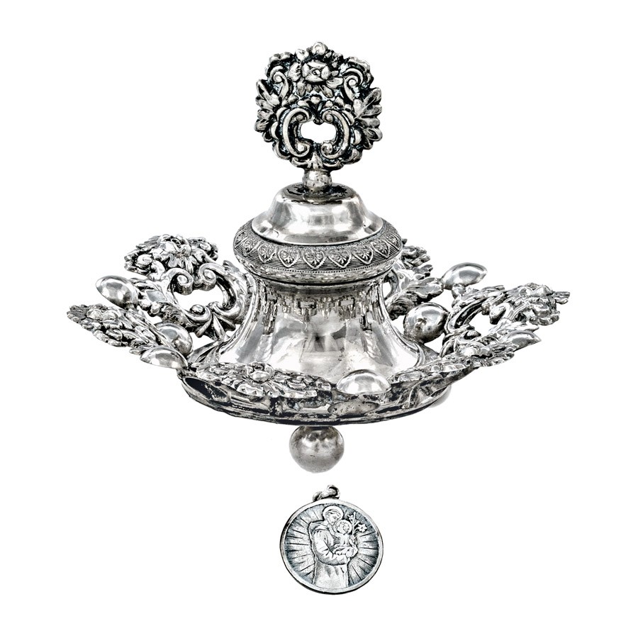 Bécs, 1860 (?), 13 latos antik ezüst, "ZM" mesterjegy, öntött test, palmettás gyűrűkkel, rózsás fogóval, három golyó lábon álló, áttört peremű tálkával, nyelve ezüstözött fém Szent Antal érmével, pótolva, Ntto: 167 g; 9, 5*12 cm