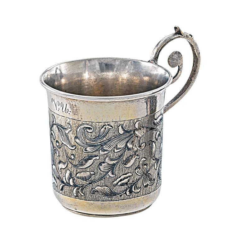 Moszkva, 1841, 84 zlotnyikos aranyozott antik ezüst, Mihail Csirmazov próbálómester és "AGK" mesterjegy, vésett, poncolt niellós díszítéssel, vésett "V.U." tulajdonosi monogrammal, kecses fül, későbbi toldás, kis talphibával , Zolotoe i Szerebrjanoe .Nr.