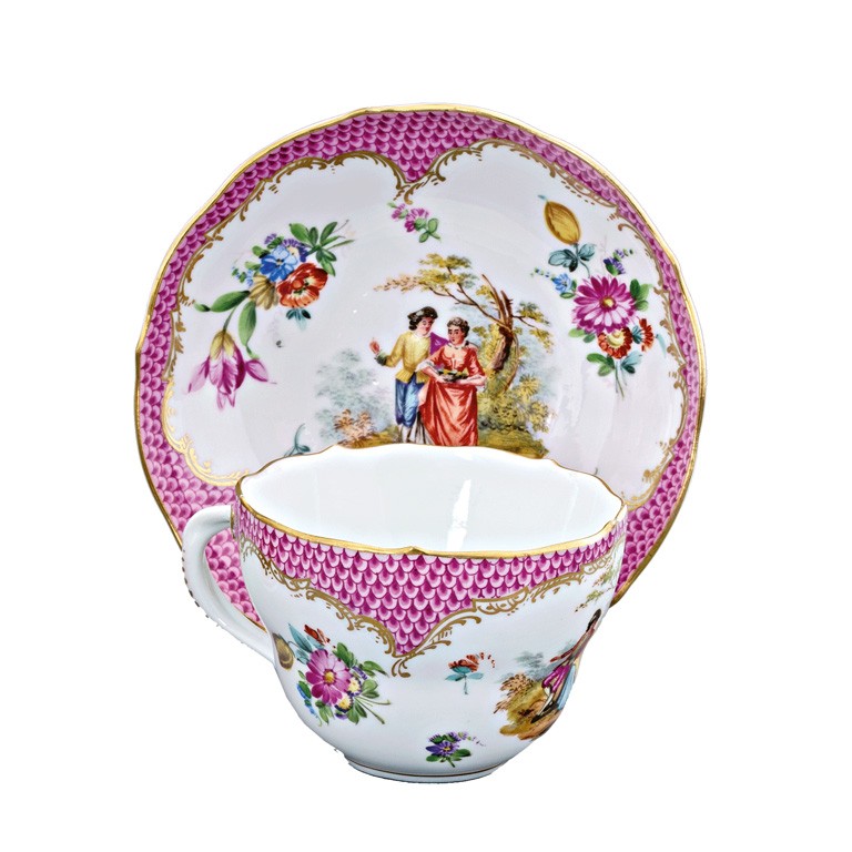 Meissen, 19. sz. második fele, festett, aranyozott porcelán, udvarlási jelenetekkel, talpakon máz alatti kék kardos jelzettel, m: 6 cm; d: 13,5 cm