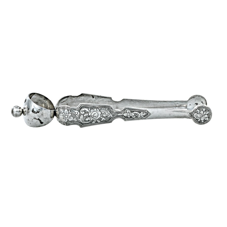 Bécs, 1859, 13 latos antik ezüst, töredékes "IT" mesterjegy, biedermeier stílusú, golyós kerek fogóval, vésett rózsás szárakkal, sérült, 38 g; h: 16, 7 cm