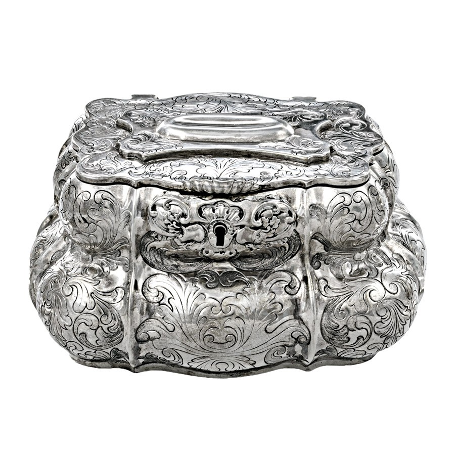 Bécs, 1850 körül, 13 latos antik ezüst, kivehetetlen mesterjegy, barokkos, hulllámzó forma, vésett, poncolt díszítéssel, zárszerkezet kulcs nélkül, apró sérüléssel, Btto: 452 g; 8x15x12 cm