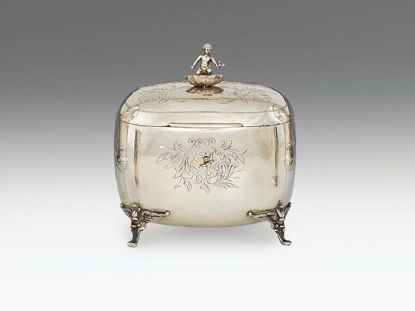 Ezüst 468 g., belül aranyozva. Négy öntött, stilizált szárnyas lábakon álló téglatest. Zsanéros fedelén öntött, cizellált és vésett