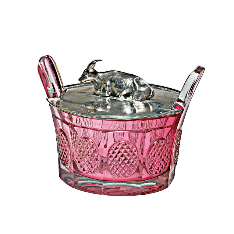 magyar, 20. sz. eleje, szelénium rubinnal színezett kristály üveg, ezüst tetővel, pihenő kecske plasztikus fogóval, "PV" mesterjegy, Ntto.: 52,2 g; m: 9,5 cm