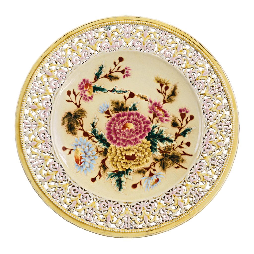 Zsolnay gyár, Pécs, 1890 körül, festett, aranyozott, áttört fehércserép, jelezve az alján: Zsolnay Pécs és a testvérek jelével és masszába nyomott Zsolnay Pécs jelzettel, 3430 formaszámmal, kis, mázhibával, tűzi repedéssel