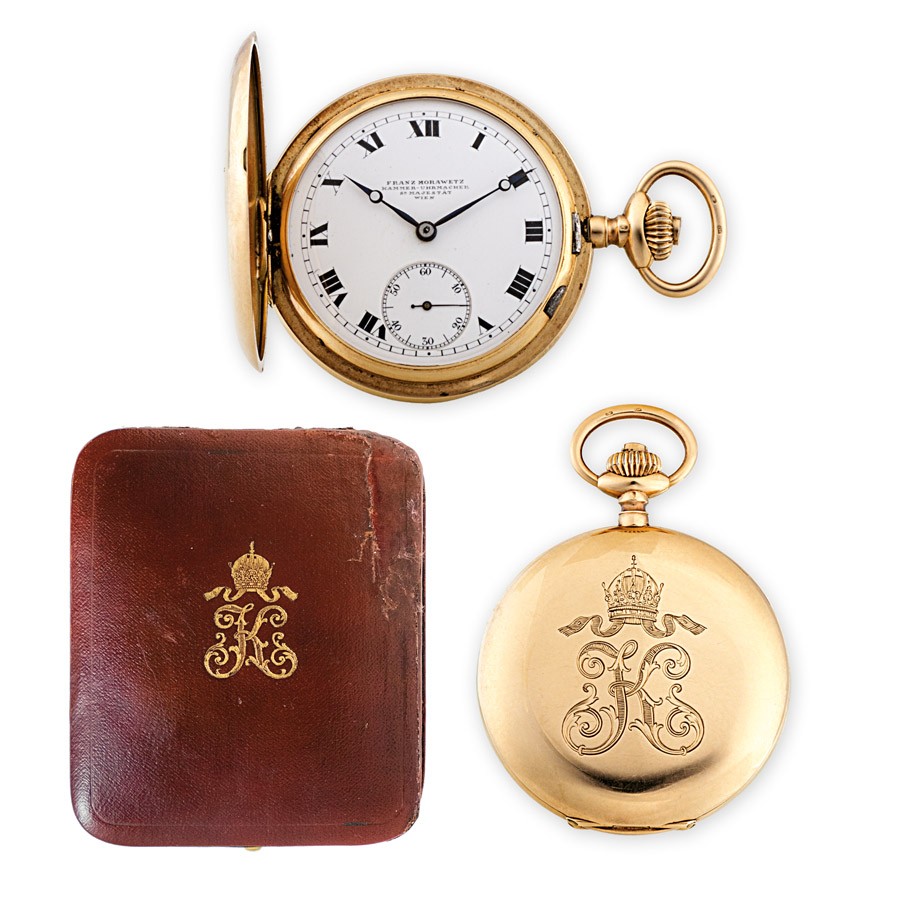 Svájc, 19. sz. vége, 1902-1922 közötti bécsi behozatali jellel ellátott, 14 k arany tok, szerkezettakaró fém, "C.C" mesterjegy, római és arab számos kis másodperckörös számlapon, tokon és az eredeti dobozán: Franz Morawetz, császári és királyi szállító bé