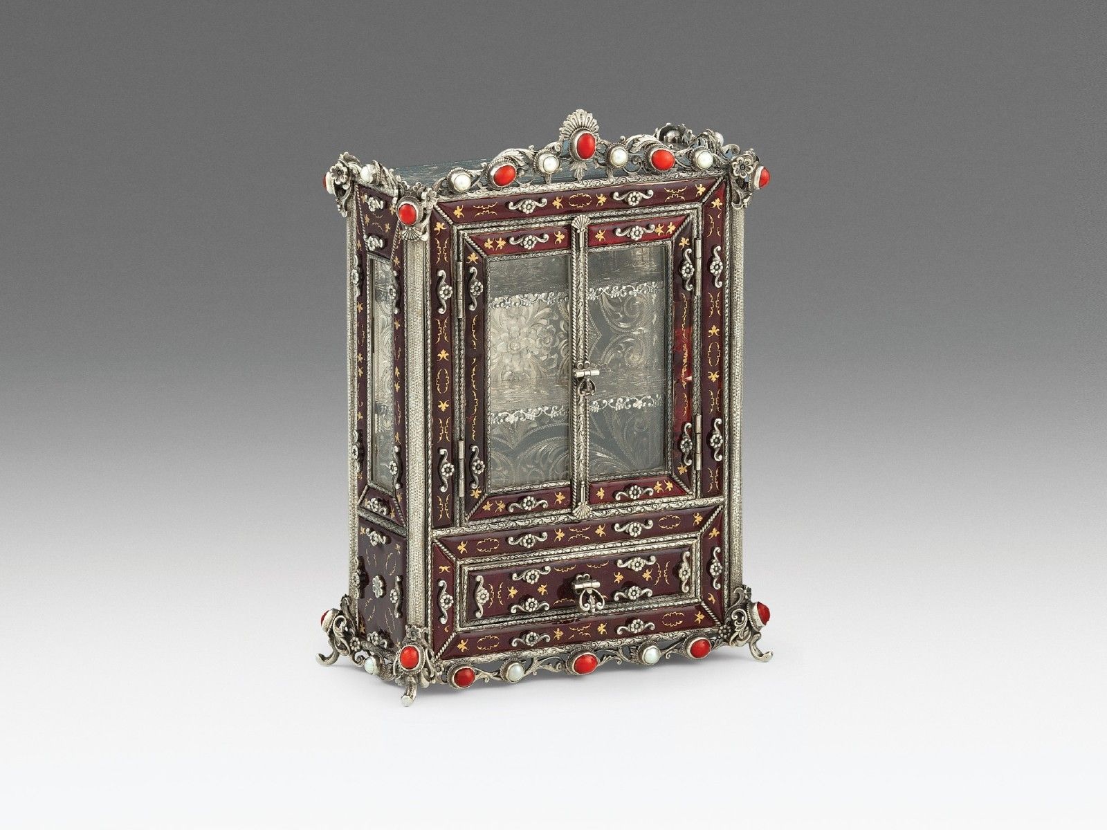 Aranyozott ezüst, 922 g. Barokk szekrényforma, belsejében két polccal, nyitható ajtóval és egy fiókkal. Felületén vésett növényi díszes alapon arannyal festett színes zománclapok, peremein korallszemekkel és gyönggyökkel ékítve.