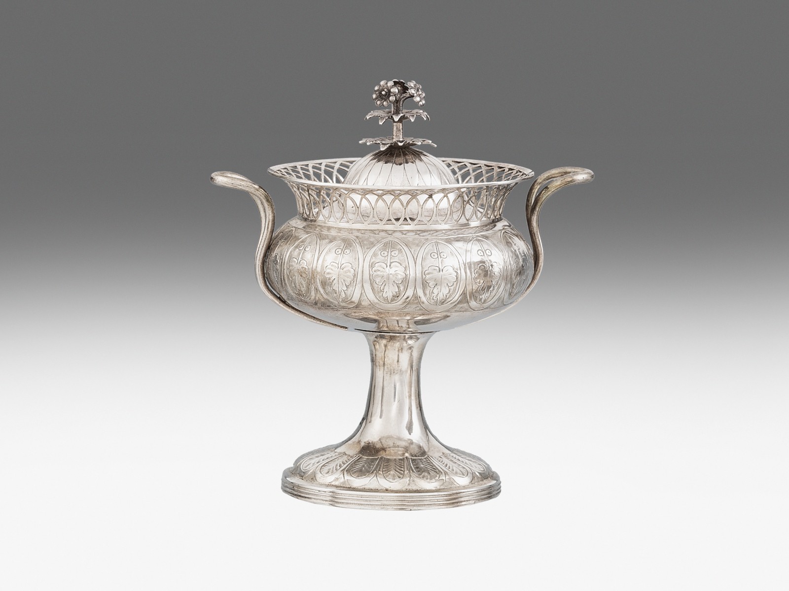Trébelt ezüst, 324 g. Kerek talpon öblös edénytest, felületén ismétlődő, trasszírozott és poncolt díszítménnyel, áttört peremmel, kétoldalt ívelt fülekkel. Leemelhető fedelén öntött és cizellált, plasztikus virág alakú fogóval. Talpán alul és fedelén belü