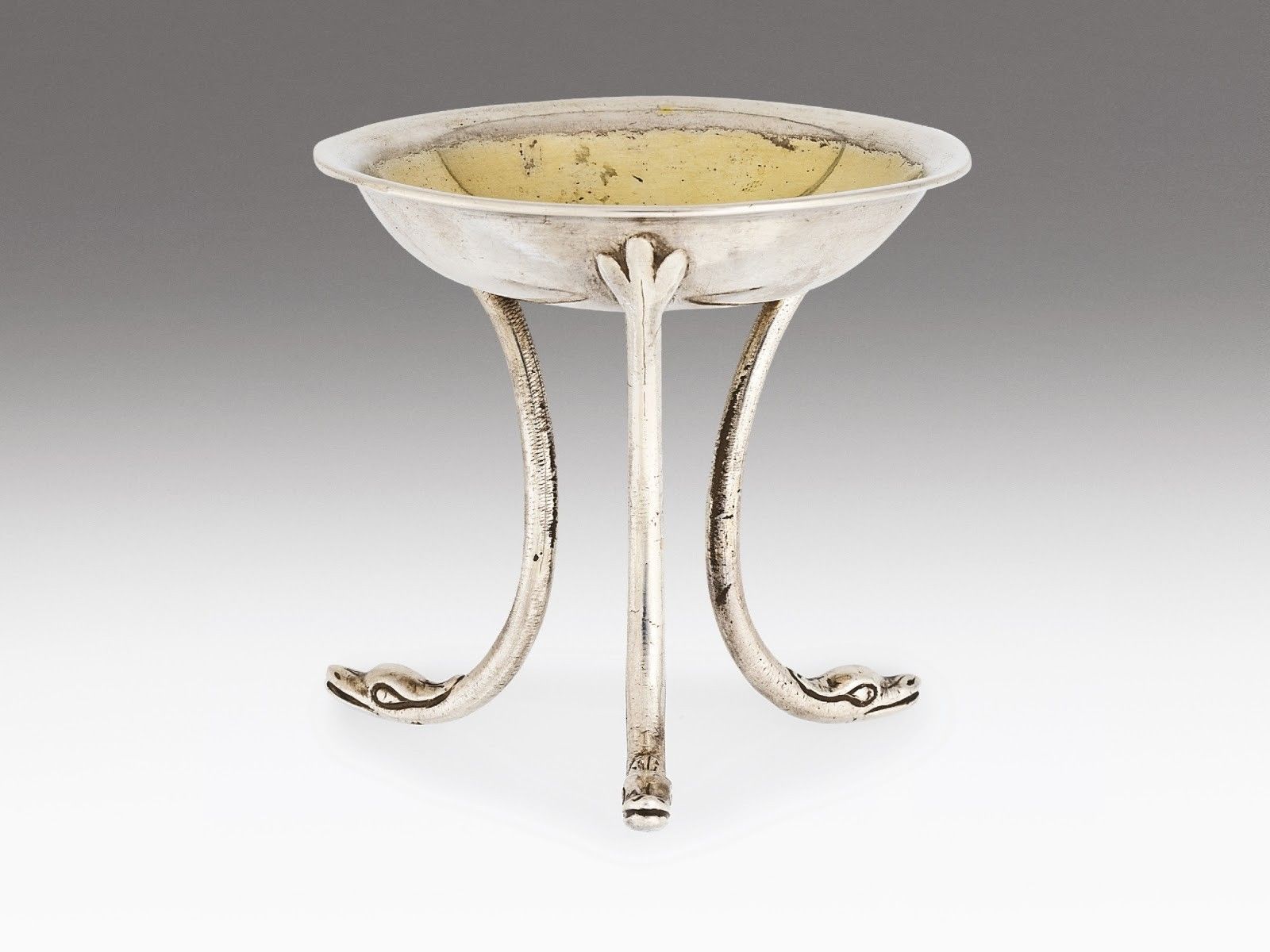 Ezüst, 95 g. Három kígyós, ívelt lábon álló belsejében tűzaranyozott öblös tálka.