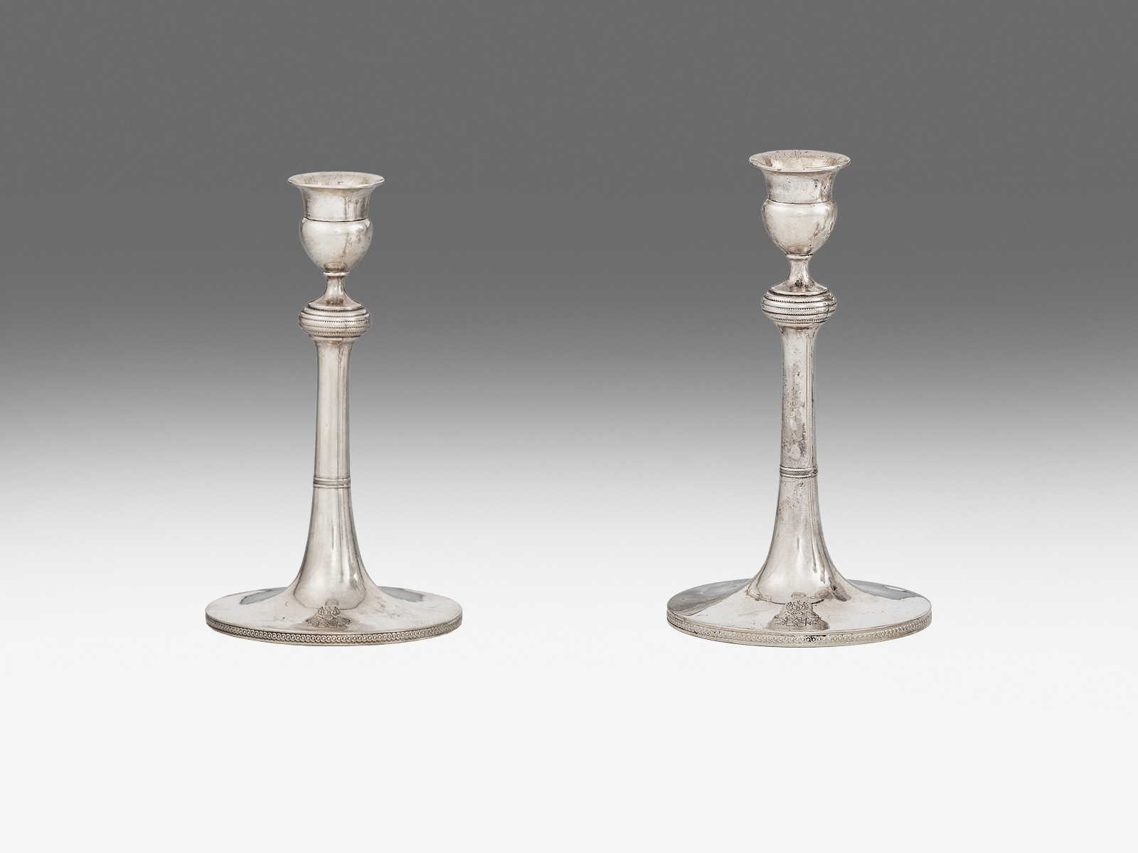 Ezüst, 431 g. Trébelt, kerek talpon osztógyűrűvel tagolt felfelé szűkülő szár, váza formájú gyertyacsészével. Talpperemén és osztógyűrűin hengerelt díszítményekkel. Talpán a Torna vármegyei Gedeon család nemesi címervésetével. Jelzés nélkül, Közép-Európa,
