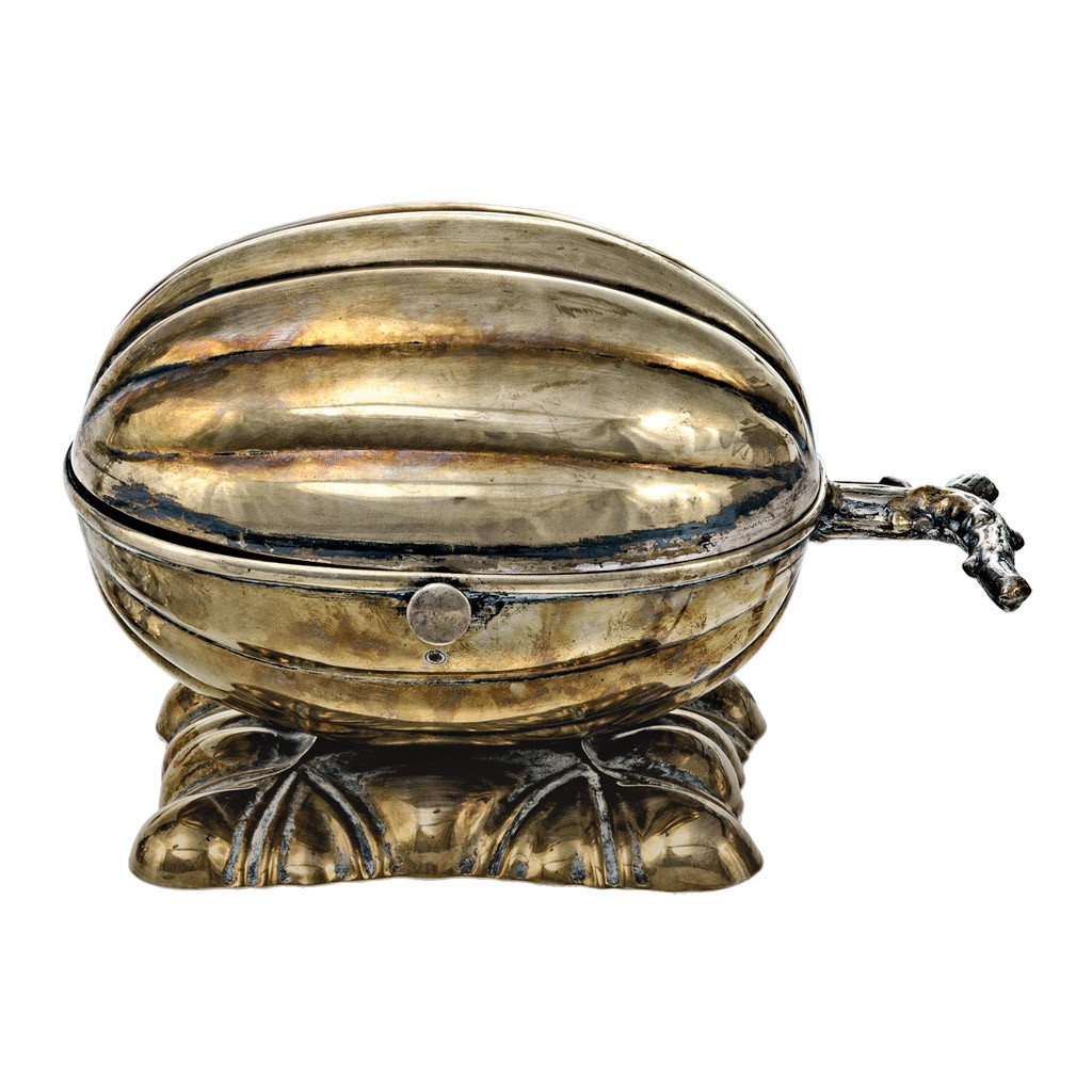 19. sz. vége, alpakka, talpon Bachmann A. S. bélyegzővel, szögletes talpon plasztikus dísztök forma, zsanéros nyitódással