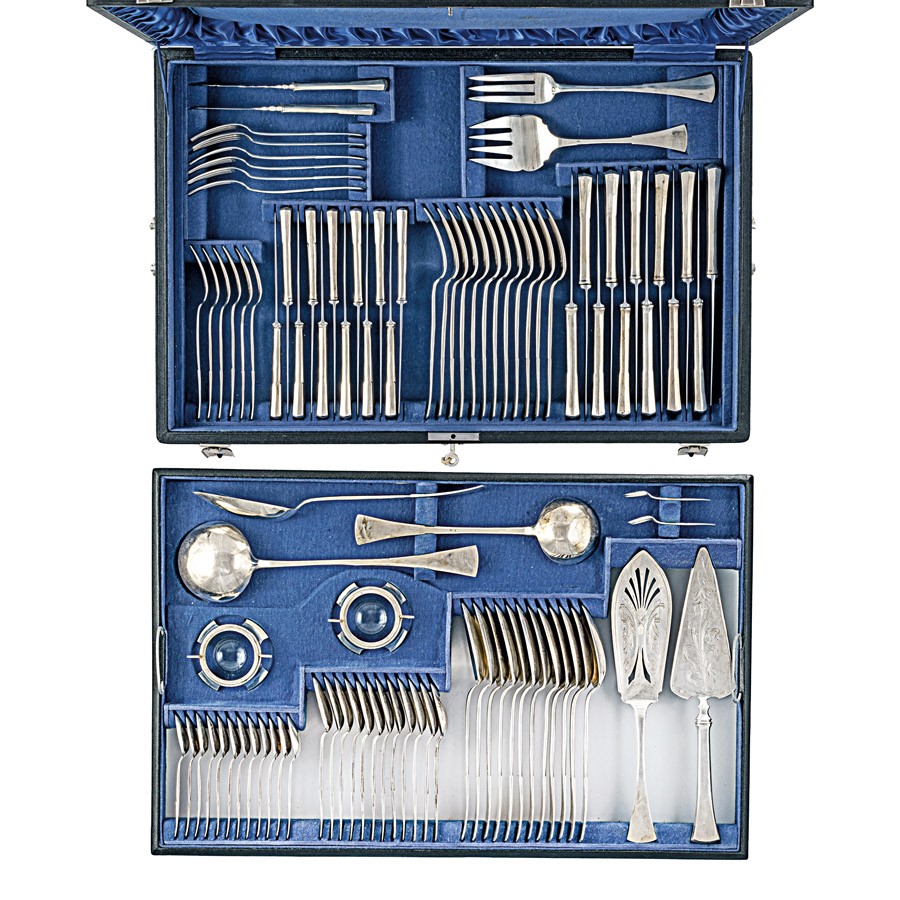 Pest, 1867-1936 közötti fémjel, 800 ezrelékes ezüst, "KM" (Klein Mózes?) és ismeretlen mesterjegy, angol vágott végű fazon, cserélt acél kés pengékkel, új dobozban, össz.: 97 db, Ntto.: 4210 g