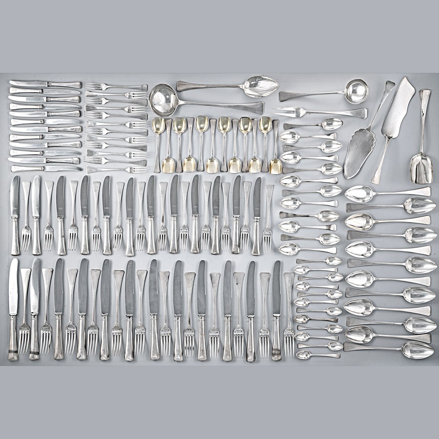 Budapest, 1937-1966 közötti fémjel, 800 ezrelékes ezüst, kalapács mesterjegy és egy tálalón Weinburn Béla mester jelzet, lecsapott végű nyelek vésett "JA" tulajdonosi monogrammal, solingeni, acél pengékkel, össz.: 127 db, doboz nélkül, Ntto: 5200 g; h: 11