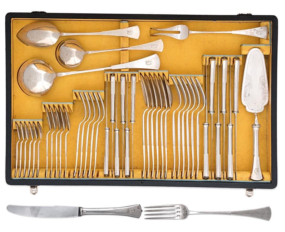 Budapest, 1937-1966 közötti fémjel, 800 ezrelékes ezüst, "SR" mesterjegy, sima, vágott angol fazon, solingeni pengékkel, "ME" tulajdonosi, vésett monogrammal, eredeti dobozában, össz: 45 db, 1 db teáskanál és 1 db desszertvilla hiányzik, Ntto: 2415 g