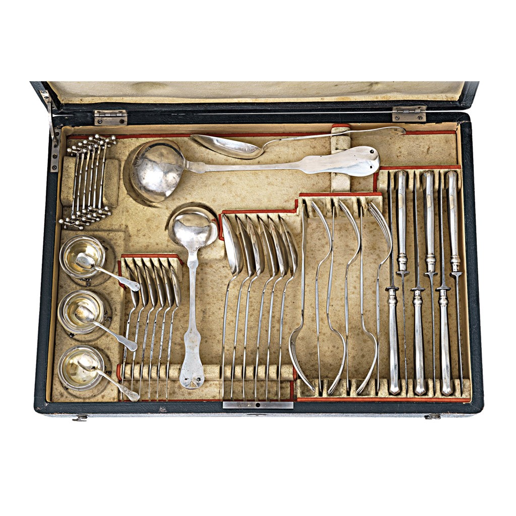 Pest, 1867-1936 közötti fémjel, 800 ezrelékes ezüst, Berthold Ungar és "DOMINUS" mesterjegyek, hegedűtok alakú nyelek acél pengékkel, KE vésett tulajdonosi monogrammal, eredeti üvegbetétekkel és dobozzal: Czinner Mór Szatmár felirattal, össz.: 39 db, Neuw
