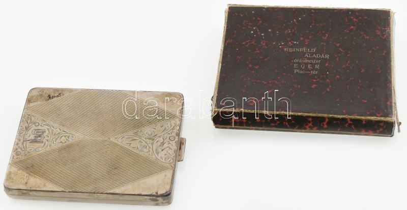 Ezüst (Ag) cigarettatárca, fedelén monogrammal, belül gravírozott felirattal (‘Emlékül hálás szeretettel a csomagolási osztálytól. Eger, 1945-1948.’). Benne 10 db Egri Dohánygyár cigaretta. Jelzett, kopásnyomokkal, bruttó: 128 g,
