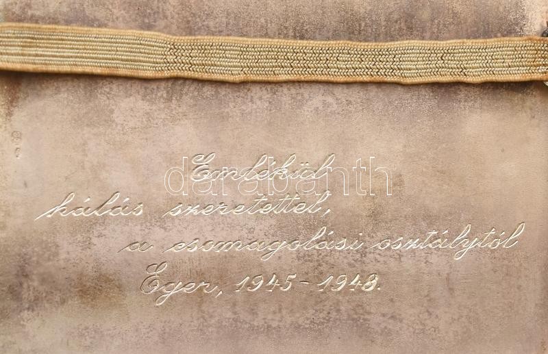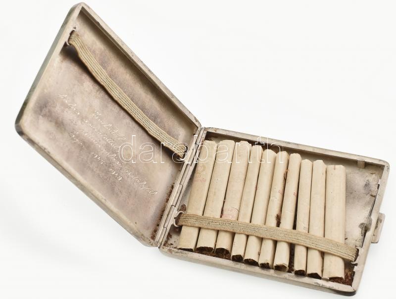 Ezüst (Ag) cigarettatárca, fedelén monogrammal, belül gravírozott felirattal (‘Emlékül hálás szeretettel a csomagolási osztálytól. Eger, 1945-1948.’). Benne 10 db Egri Dohánygyár cigaretta. Jelzett, kopásnyomokkal, bruttó: 128 g, 10×8 cm. Eredeti, sérült