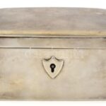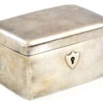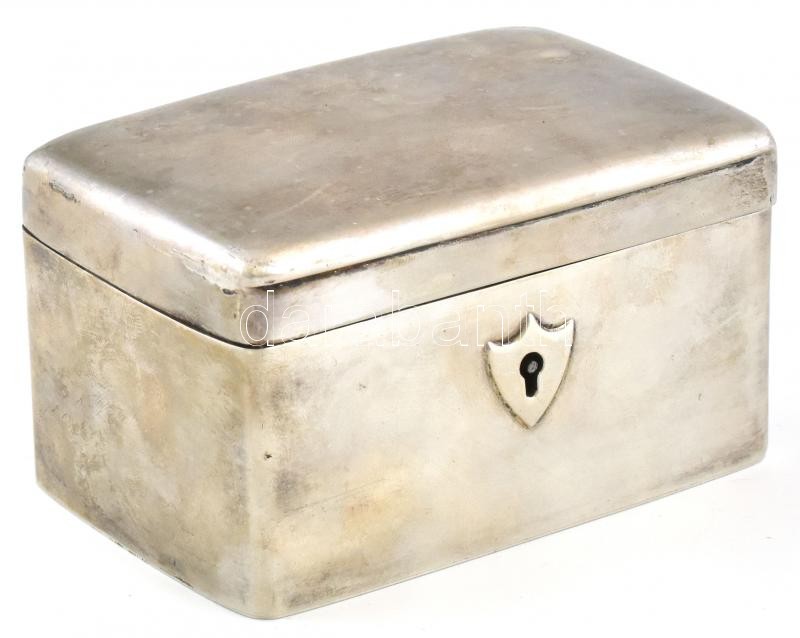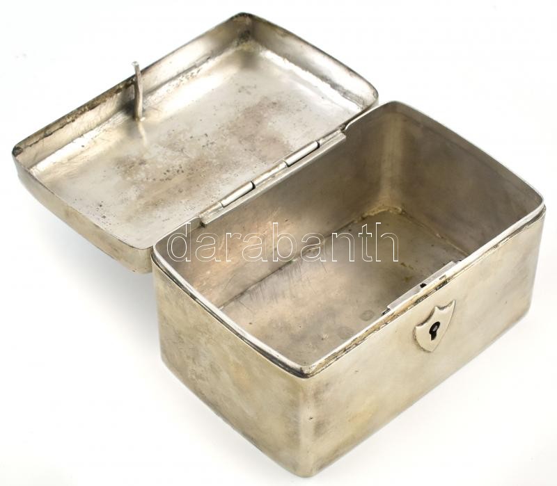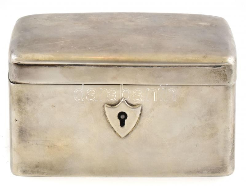 Ezüst (Ag) Empire Stílusú cukordoboz + kulcs. Jelzett, kopott, működő zárral. Nettó: 280g, 11x7x6cm, . (A fémjelzés ismeretlen)<a href="https://www.darabanth.com/hu/gyorsarveres/412/kategoriak~Nemesfem-Disztargyak-Orak-es-Ekszerek/Nemesfem-Disztargy