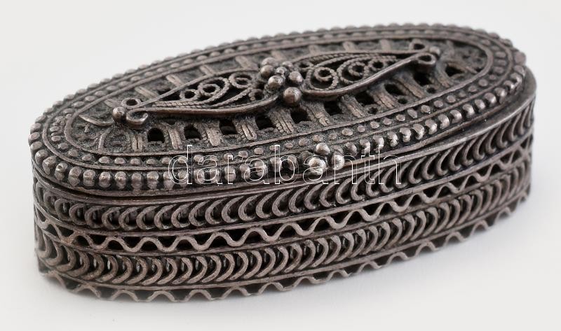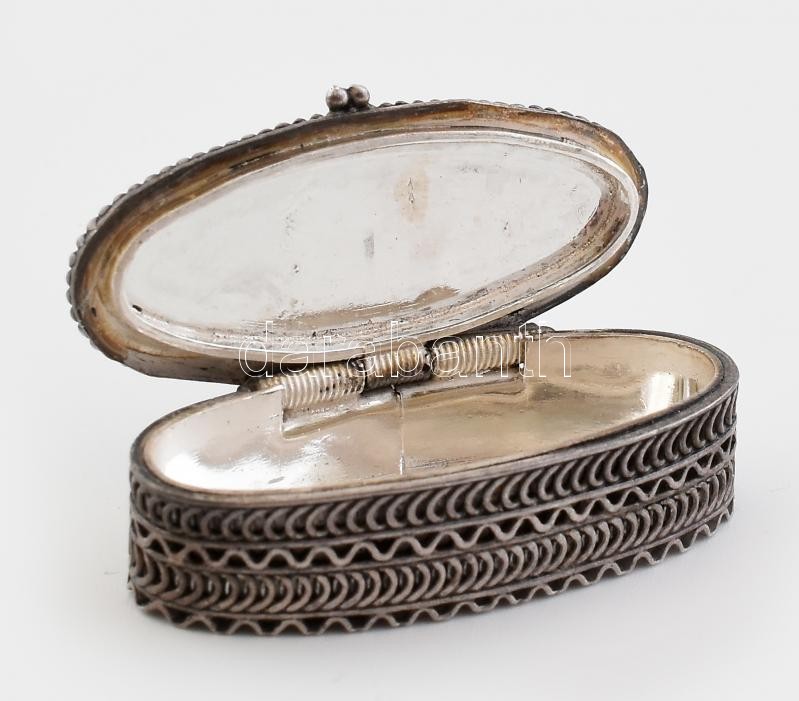 Ezüst (Ag) gyógyszeres dobozka, jelzett, 4×1,8cm, nettó:20g<a href="https://www.darabanth.com/hu/gyorsarveres/412/kategoriak~Nemesfem-Disztargyak-Orak-es-Ekszerek/Nemesfem-Disztargyak-Orak-es-Ekszerek~500031/Ezust-Ag-gyogyszeres-dobozka-jelzett-4×1-