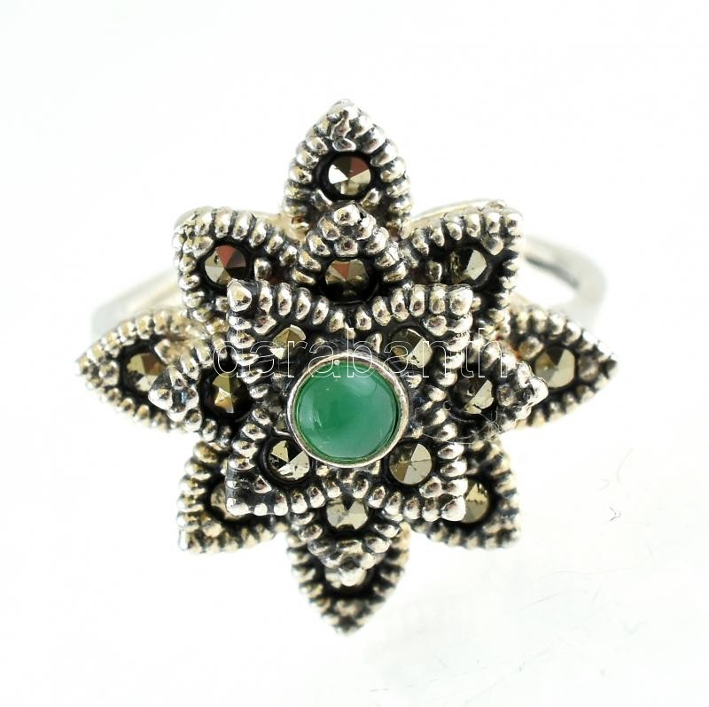 Ezüst (Ag) virágos gyűrű markazittal és zöld kővel, jelzés nélkül, méret: 53, bruttó: 4,7 g