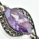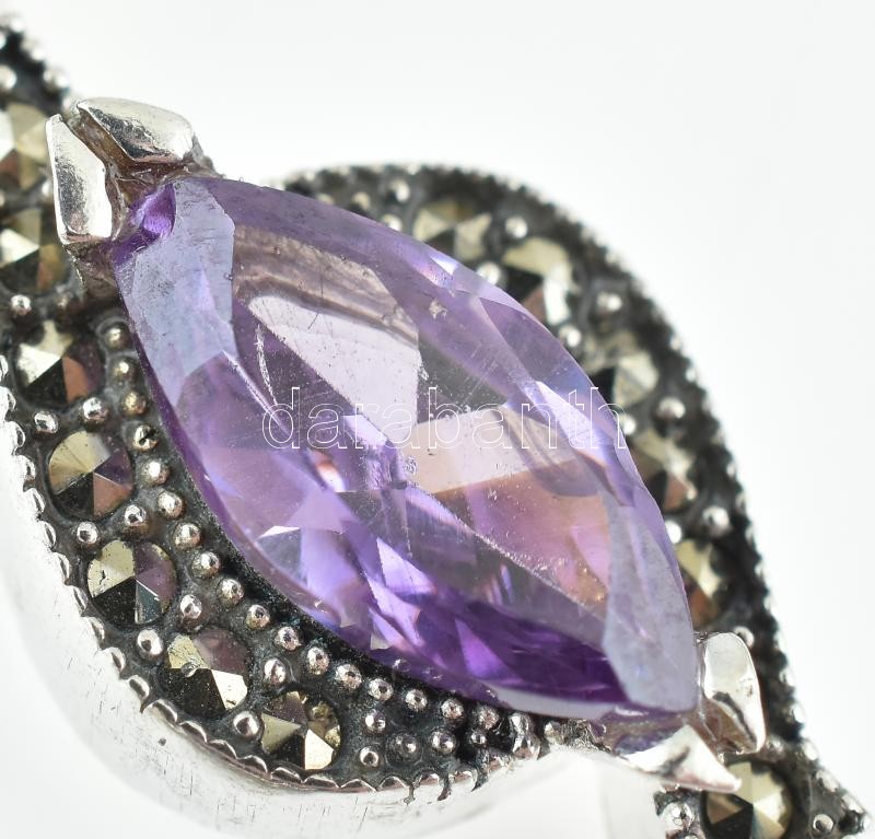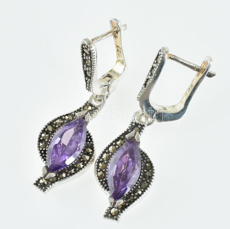 Ezüst(Ag) fülbevalópár lila kővel és markazitokkal, jelzett, h: 4 cm, bruttó: 7 g<a href="https://www.darabanth.com/hu/gyorsarveres/411/kategoriak~Nemesfem-Disztargyak-Orak-es-Ekszerek/Nemesfem-Disztargyak-Orak-es-Ekszerek~505031/EzustAg-fulbevalopa