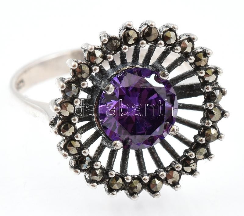 Ezüst(Ag) kerek gyűrű lila kővel, jelzett, méret: 56, bruttó: 3,9 g