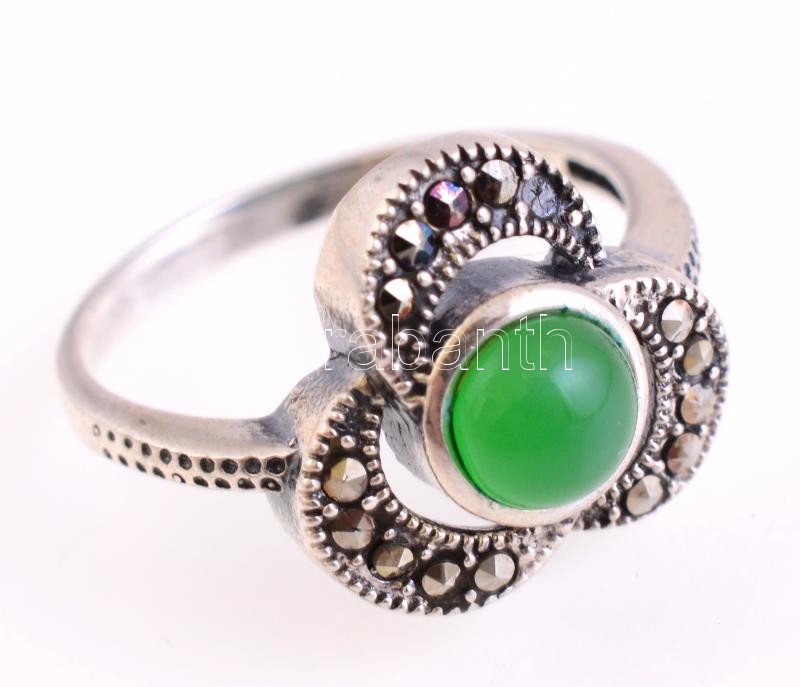 Ezüst(Ag) markazitos, zöld köves gyűrű, jelzett, méret: 57, bruttó: 4,06 g