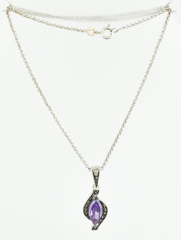Ezüst(Ag) nyaklánc markazitos lila köves medállal, jelzett, h: 39 cm, bruttó: 5,83 g