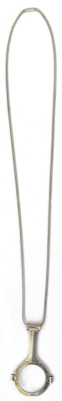 Ezüst(Ag) Péter Vladimir (1947-) által tervezett nagyító láncon, jelzett (Wladis), h: 76 cm, bruttó: 52,1 g, reprodukálva a Horváth-Kelényi-Buzinkay-Ébli: Értékmentő szenvedély című könyv 97. oldalán. Kiállítva: Bp., 2008, Iparművészeti Múzeum.