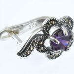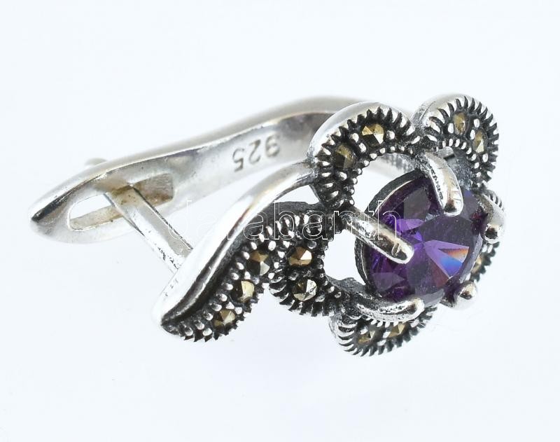 Ezüst(Ag) virágos fülbevalópár, markazittal és lila kővel, jelzett, h: 2 cm, bruttó: 5,6 g<a href="https://www.darabanth.com/hu/gyorsarveres/414/kategoriak~Nemesfem-Disztargyak-Orak-es-Ekszerek/Nemesfem-Disztargyak-Orak-es-Ekszerek~1000001/EzustAg-v