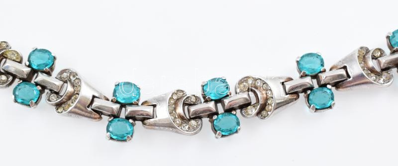 Ezüst(Ag) zöld-fehér kövekkel gazdagon kirakott karkötő, jelzett, h: 18 cm, bruttó: 34,5 g