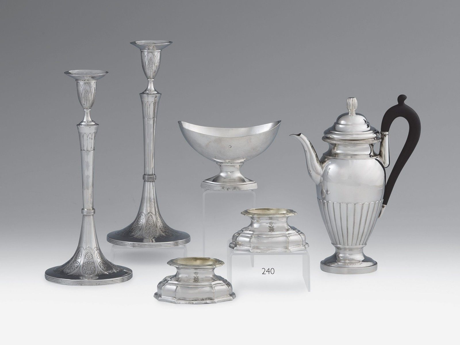 Kikiáltási ár: 50 000 FtTrébelt ezüst, 515 g. Három öntött, oroszlánmancsos lábon álló kerek tál, hengerelt peremszéllel. Jelzett: Róma, XIX. század első fele. M.: 5 cm; átm.: 23,5 cm
