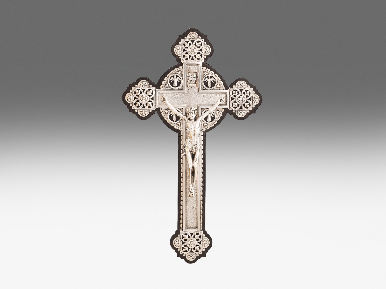 a megfeszített Krisztus alakja, körülötte négy angyal, felette INRI felirat. Pácolt