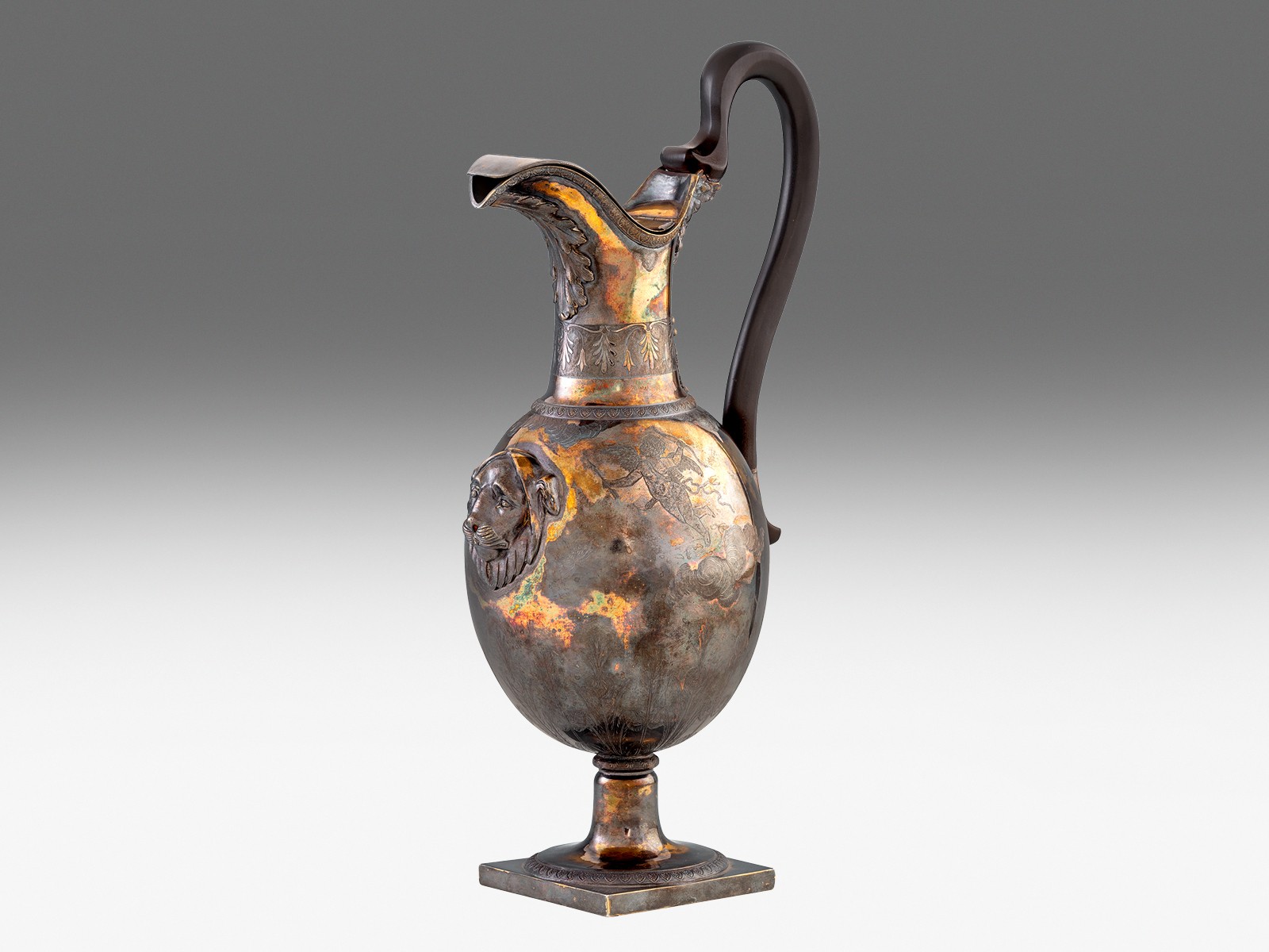 Trébelt ezüst, 829 g. Négyzet alakú talapzaton kerek talp rövid szárral, rajta körte formájú edény, zsanéros billenőfedéllel.