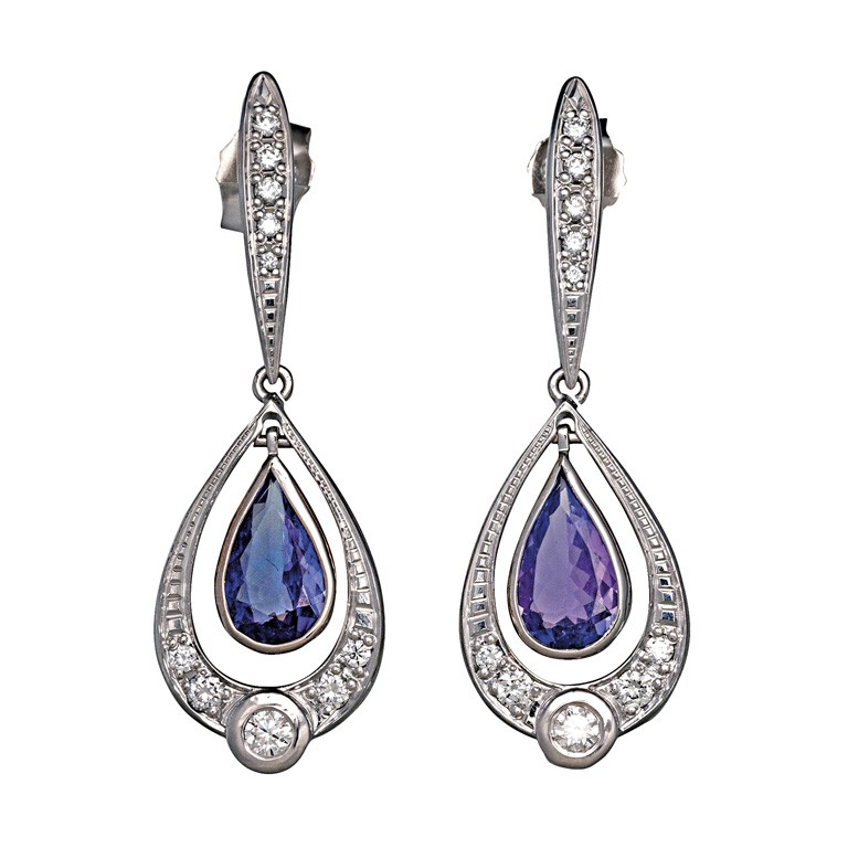 20. sz. vége, 2016 utáni budapesti fémjellel ellátva, 14 k fehérarany, csepp alakú csüngőben 2 db liláskék tanzanit kő cca. 2 ct és 10 db modern csiszolású briliáns cca. 0,47 ct ékítéssel, 5,5 g; h: 3,7 cm