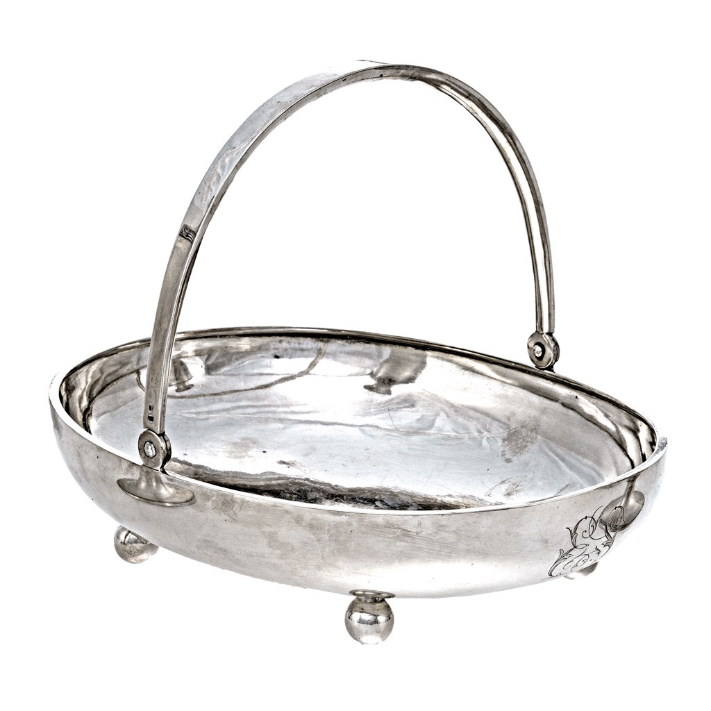 Moszkva, 1895, 84 zlotnyikos ezüst, AC próbálómester, K. Fabergé és cirill betűs "IP"mesterjegy, négy golyó lábon ovális, kalapált tál, vésett ES tulajdonosi monogrammal