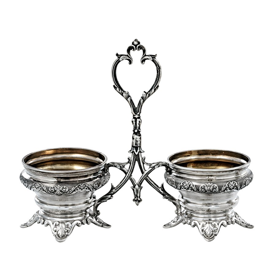 francia, 19. sz. közepe, 1838 utáni fémjel, 950 ezrelékes antik ezüst, Flamand Fils bélyegzővel, ívelt forma, gilosált, vésett díszítéssel, pálcás fogóval összekötve, 136 g; 13*15, 2*6 cm