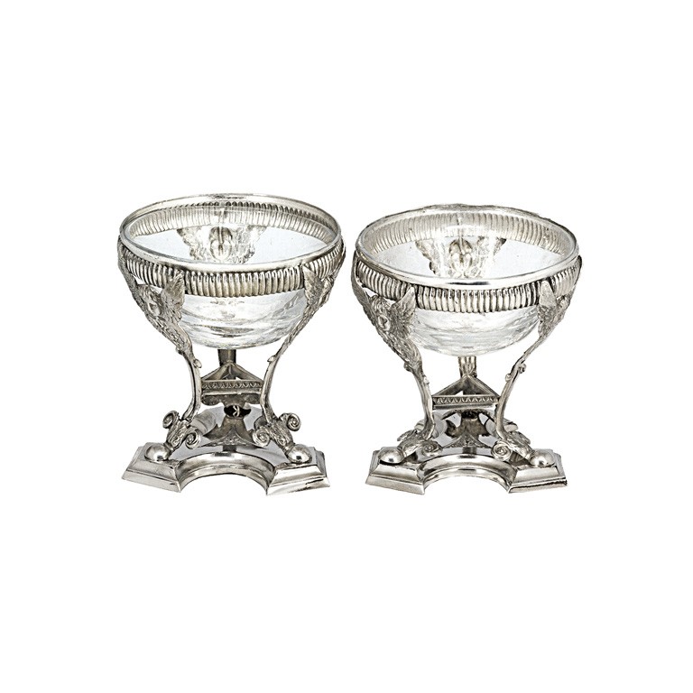 francia (?), 19. sz., antik ezüst, jelzés nélkül, háromágú talpon, kecses angyalfejes lábak összekötővel, kerek színtelen üvegbetéttel, restaurált, Ntto: 100 g; 7,5*7,2 cm