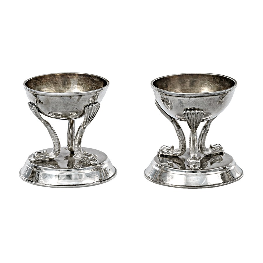 Budapest, 1999-2005 közötti fémjel, 925 ezrelékes ezüst, "CsT" mesterjegy, delfin formájú lábakon öblös, belső részen aranyozott tálkák, 239 g; 6, 6*7 cm